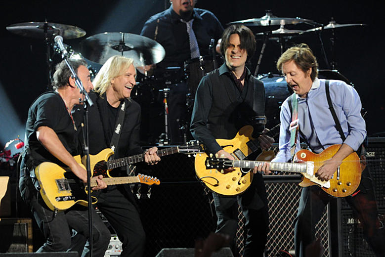 That sequence alone would have etched the night into memory, but as “The End” built to its crescendo, the stage ignited. Bruce Springsteen, Joe Walsh, and Foo Fighters’ Dave Grohl strode out to join the fray. Suddenly, six guitar wizards—rounding out with McCartney’s own Rusty Anderson and Brian Ray—traded blistering, bite-sized solos, mirroring the joyful interplay of McCartney, George Harrison, and John Lennon from the 1969 original. It was reverence wrapped in raw energy, a living bridge from Abbey Road’s studio haze to Grammy glory.