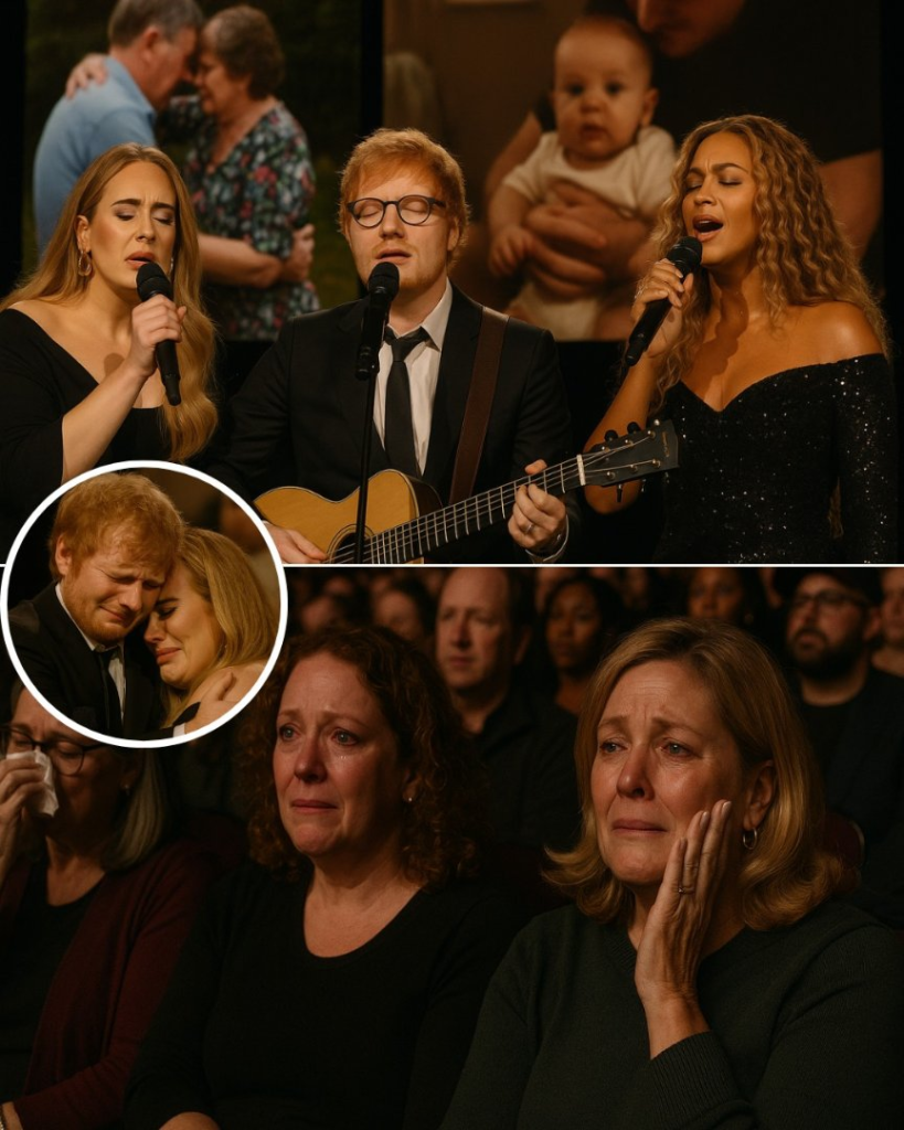 The instruments died away. The backup singers went silent. The air in the room felt heavy enough to shatter. Beyoncé turned toward Adele, her gaze steady and supportive. Adele, her face streaked with tears, gave a singular, resolute nod. Ed Sheeran, the night’s musical architect, stepped back into the shadows, clearing the path for what can only be described as a miracle.