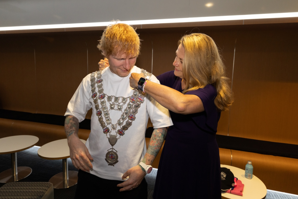 The ceremony took place at the historic home ground of Ipswich Town Football Club, and the atmosphere was thick with emotion. For those who follow music culture, Ed’s devotion to his Suffolk roots is legendary. He isn’t just a celebrity fan; he sponsors the local team and carries the town’s identity with him whether he’s playing Madison Square Garden or Wembley.