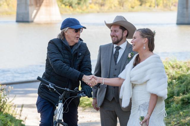 In an unforgettable waterfront moment, Sir Paul McCartney offered something far beyond the ordinary for a young couple’s wedding day. Jen Roscoe and Steve Gregg were midway through posing for their wedding photos when the 83-year-old Beatles legend, casually riding his bike past the ceremony, spontaneously stopped to gift them a short, improvised song. No guitars. No cameras. Just McCartney, his voice gentle yet full of warmth, performing a tune created solely for the couple in that fleeting moment. The gift, unexpected and intimate, left the bride and groom overwhelmed, tears welling up as they realized they were experiencing something most fans only dream of.