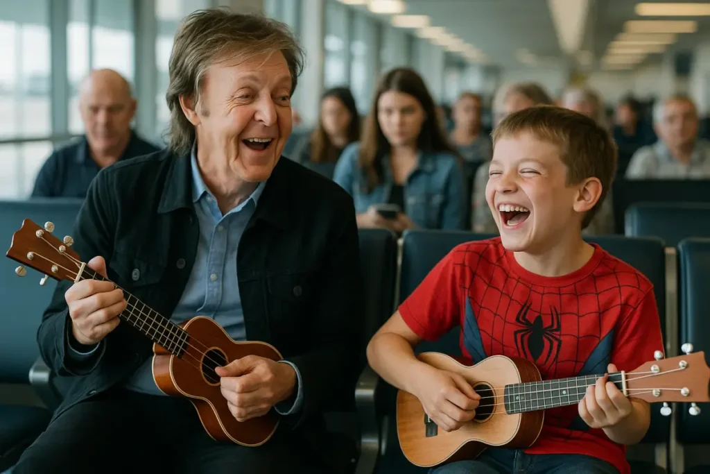 According to eyewitnesses, a young boy was strumming “Yesterday” on his ukulele while sitting on a bench near the bustling terminal. Most travelers were absorbed in their own routines, checking phones, rushing to gates, and maneuvering luggage through the crowd. Then, as if drawn by an invisible thread, Paul McCartney, who had been quietly seated nearby, glanced over and offered a polite request: may he borrow the instrument? The boy, initially stunned, nodded, and in the next instant, the terminal transformed.